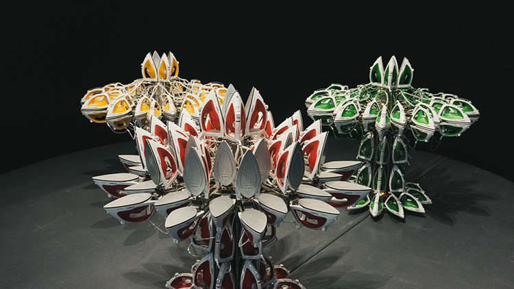 ‘Joana Vasconcelos staat bekend om haar scherpe gevoel voor verhoudingen, meesterlijk gebruik van kleur en bijzondere materiaalkeuze, zoals huishoudelijke voorwerpen, muurtegels, textiel, medicijnen, urinoirs, telefoons, pannen en plastic bestek. Als een hedendaagse alchemist transformeert zij alledaagse objecten en clichés uit de consumptiemaatschappij tot kunstwerken vol betekenis en symboliek.’