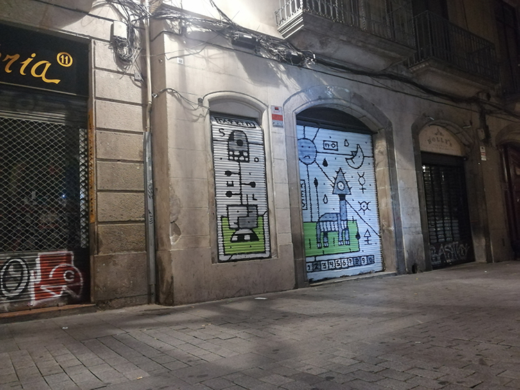 Naast het maken van muurschilderingen, waar zijn focus ligt, illustreert, animeert, designed en creëert Rik publiekelijke interventies onder de naam Riq Etiq. Denk bij het laatste aan het aanbrengen van willekeurig gevonden voorwerpen in de buitenruimte. Laatst bijvoorbeeld, stond hij in een verlaten pand een muurtje te verven, en terwijl hij de omgeving aan het ontdekken was vond hij een stapel kartonnen wegwerp bordjes. Deze waren ideaal om te bewerken en ze vervolgens ergens tegenaan te kitten. En zo geschiedde. De kartonnen wegwerp bordjes hangen nu hier en daar in de straten van Barcelona. Met een tekening erop uiteraard.