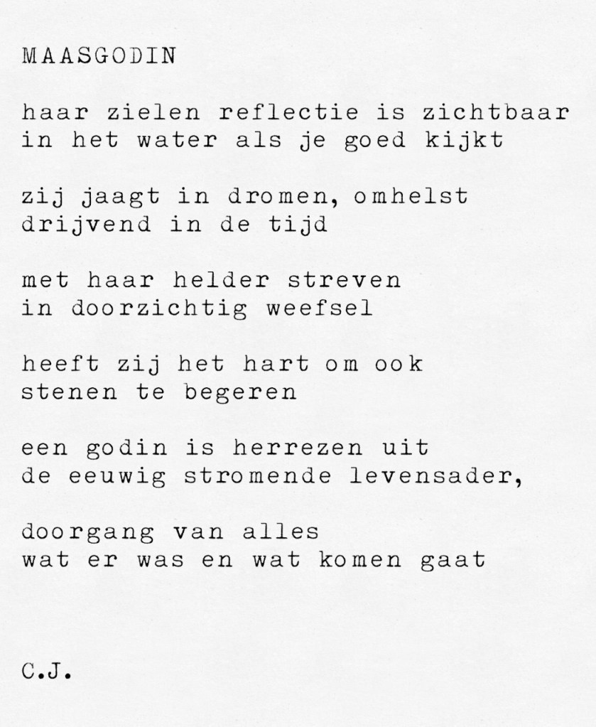 Mijn laatste project heet Maasgodin. Dit deed ik samen met de getalenteerde fotograaf Asja Jäger-Bouw. Ze wilde mij fotograferen en vroeg of ik er een gedicht bij kon schrijven. Daar ben ik trots op, omdat het voor mij de eerste opdracht is waar ik bij beeld wat iemand anders heeft gecreëerd een tekst heb geschreven. Ik schudde het ook niet zomaar uit m’n mouw, zo werkt het bij mij niet. Dus het kostte even wat tijd, maar ineens had ik het en kwam het er vloeiend uit.