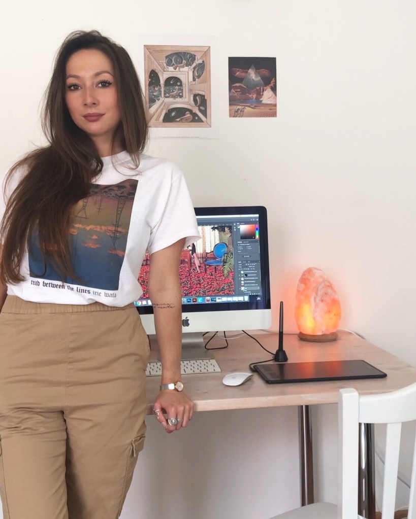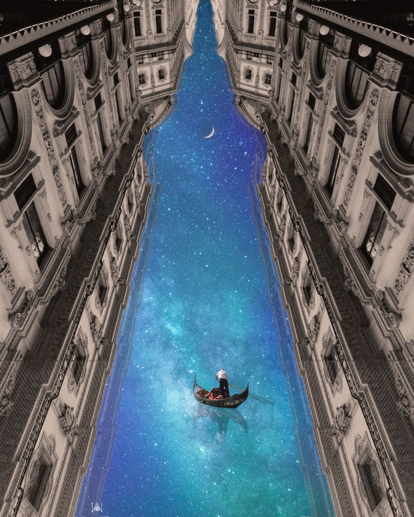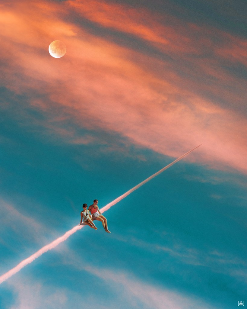 “In het begin deed ik veel met het heelal, omdat ik dit zo’n mooie plek vind en deze dichterbij aarde wilde halen. De laatste tijd maak ik steeds meer minimalistischere werken waarbij ik landschappen ondersteboven draai om een nieuw perspectief te creëren. Ik gebruik ook graag vintage beelden uit de 50’s en 60’s. Dit versterkt voor mij persoonlijk het surrealisme en het zorgt voor een clash in tijdperken.”