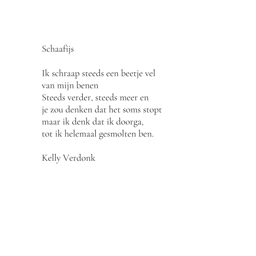 De 29-jarige Kelly Verdonk heeft een jaar geleden een carrièreswitch gemaakt met als doel haar hart achterna gaan. Wat haar hart wilt? Voor en met mensen werken. En schrijven! Momenteel is ze parttime hbo en mbo docent in Digital Marketing en daarnaast focust Kelly zich op haar schrijversbestaan en de schrijfworkshops die ze geeft.