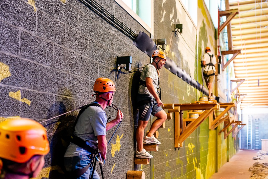 Indoor vind je sportklimmen en klimparcoursen, uitdagende zip-line’s en een vrije val met een hoogte van 12 meter.