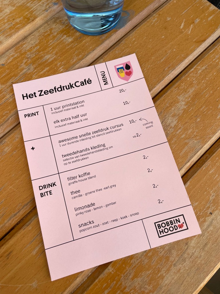 Op dit moment zijn we op vrijdag en zaterdag van 12:00 tot 17:00 uur geopend. De komende maanden gaan we rustig aan het Zeefdruk Café verder opbouwen en hopen we een plek te worden waar jonge mensen een inspirerende bijbaan kunnen vinden.”
