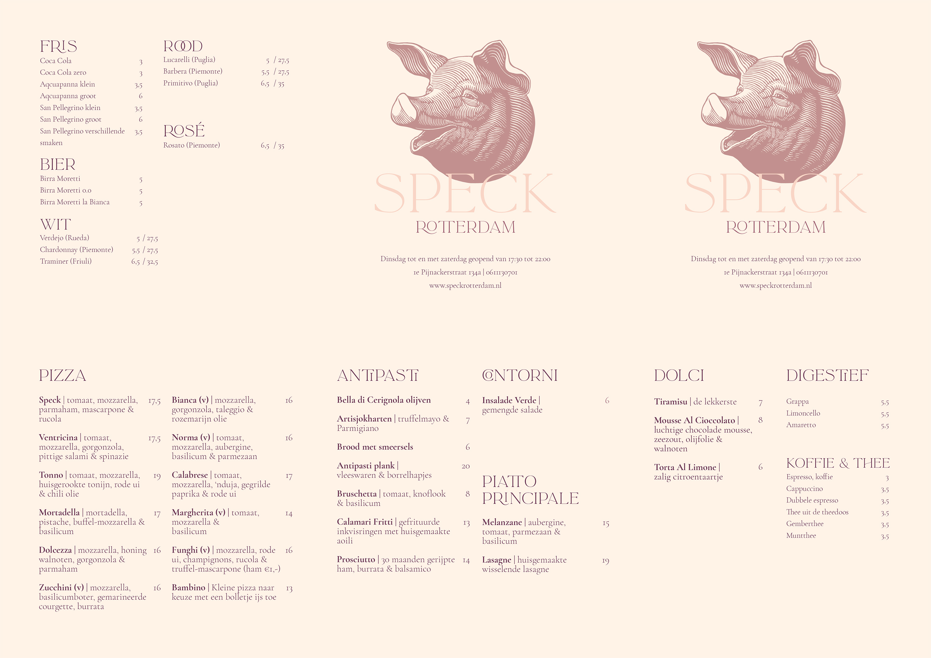 Speck zit zo goed als altijd vol én de telefoon staat gloeiende vanwege alle pizza bestellingen voor thuis. Al jaren (en dan bedoelen we ook echt jáaaren) loopt Speck als een trein. Dit gemoedelijke restaurant met open en knusse lay-out geeft inkijk op de steenoven waar de lekkerste lekkernijen in worden gebakken. En in de zomer zit je gezellig voor de deur, in een mooie straat van het oude Noorden.