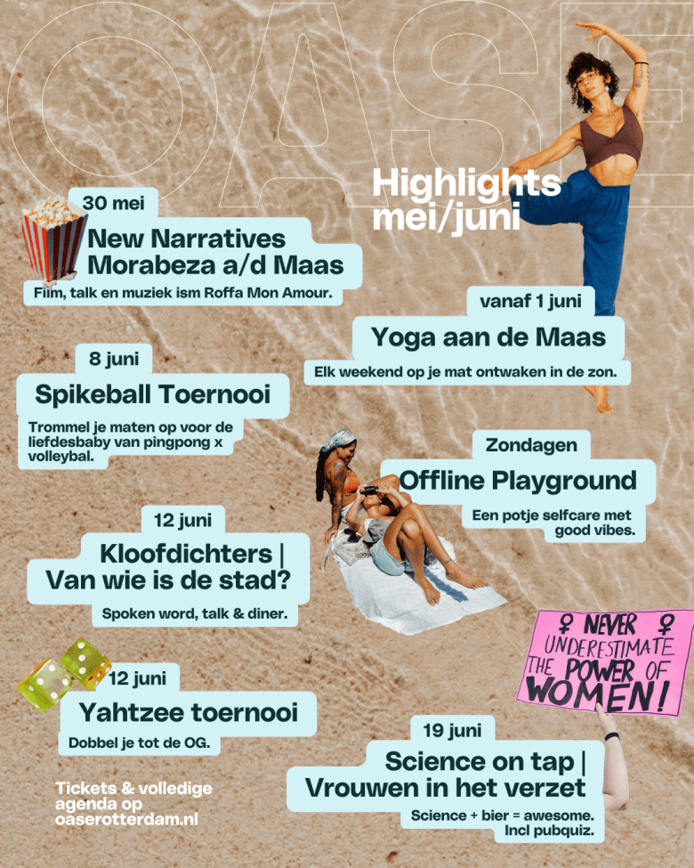 Verder zijn er talks, workshops, XXL-gamemiddagen, vintage en art markten, gezamenlijke diners en muziekoptredens. De agenda wordt elke week verder aangevuld. Bekijk het programma en tickets via de OASE agenda en voor de strandtent specifiek op de OASE website voor meer informatie.