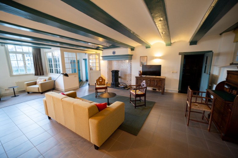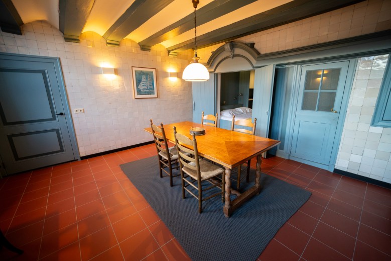 Wat direct opvalt bij binnenkomst is de woonkamer. Ruimtelijk, stil en doordrenkt met karakter. De combinatie van historische elementen en modern interieur zorgt voor een sfeer die zowel stijlvol als toegankelijk is. Zachte kleuren, natuurlijke materialen en het gefilterde daglicht creëren een bijna meditatieve rust. Dit is zo’n plek waar je automatisch langzamer gaat leven – een boek erbij, een goed gesprek, of simpelweg even niets.